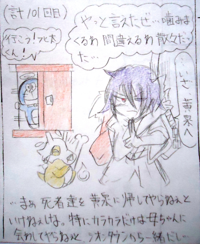 あとどこでもドアで黄泉に入ったドラさんは中々入ってこないフヒ太くんをずっと待ってました。後ろ姿がシュール…